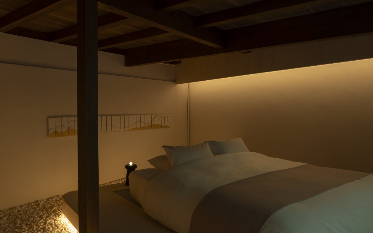 周りを白石で囲まれた浮遊感を感じるベッドは外へのデッキへと同じ幅で繋がり、内と外、そしてその間(ま)を、シームレスに彩ります。
