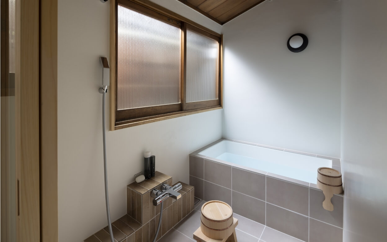 うたひのテーマカラーである優しい色合いのタイルを用いた浴室。ガーデンにて摘んだ薬草をミルで擦ったオリジナルのバスソルトで、体や心までほぐれる時間を過ごすことができます。選りすぐりのスキンケアで、身体を禊ぎ、また新しい自分と出会える場所です。
